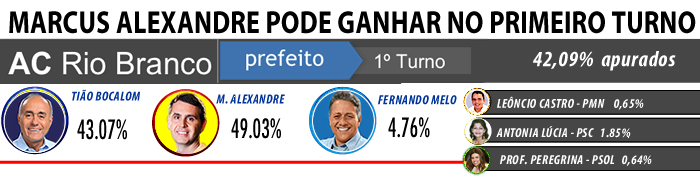 Com 95,95% das urnas apuradas, o candidato petista Marcus Alexandre lidera as eleições em Rio Branco com 48,38% das intenções de votos, contra 43,74%. O terceiro colocado é o peemedebista Fernando Melo com 4,75% dos votos válidos e Antônia Lúcia, 1,91%. Leôncio de Castro e Peregrina tem menos de 1% dos votos. Com esse resultado terá segundo turno.
