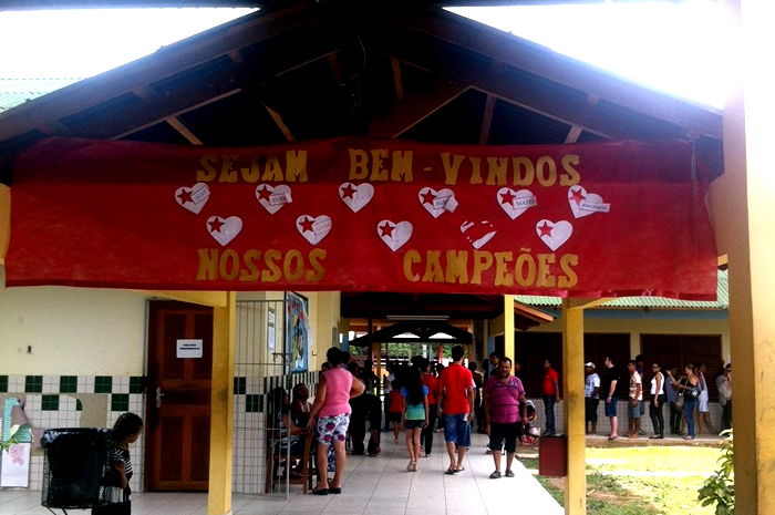 O material que faz alusão às cores do Partido dos Trabalhadores (PT) tinha os dizeres: “sejam bem vindos, nosso campeões”.