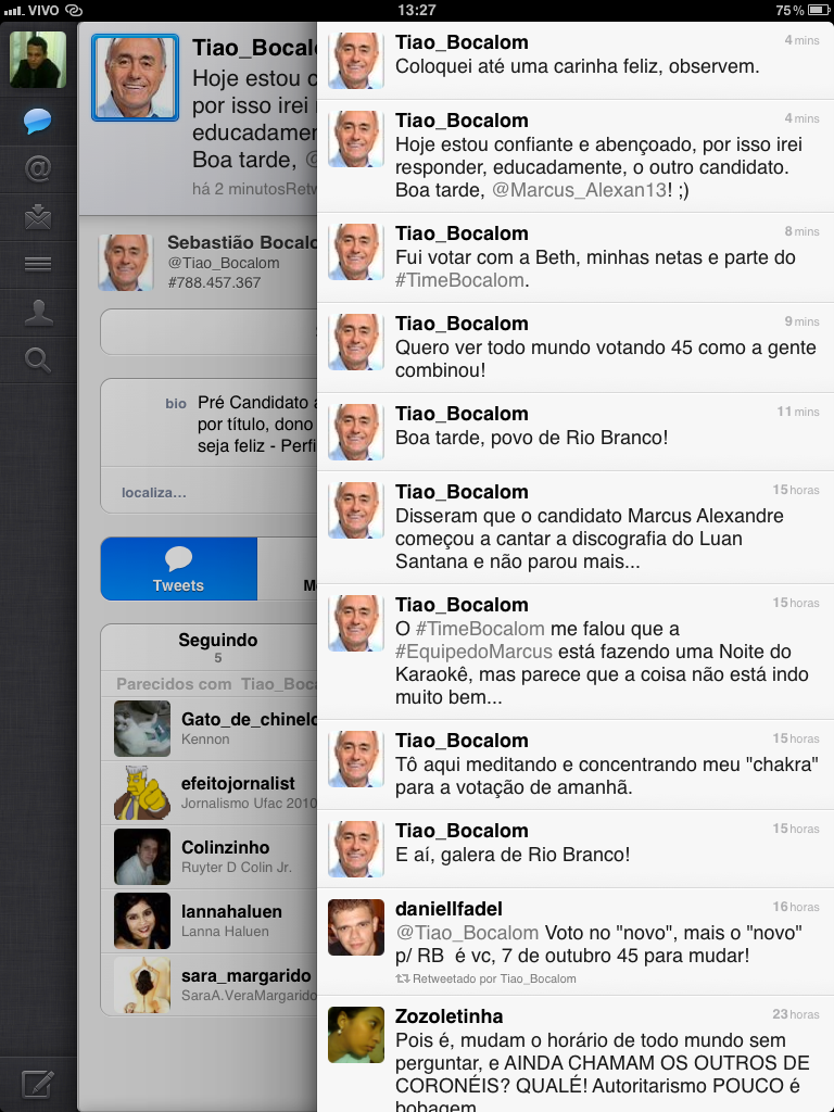 A assessoria do PSDB informou que o candidato tucano não tem twitter, apenas facebook. Pelo falso twitter, Bocalom teria cumprimentado Marcus Alexandre.