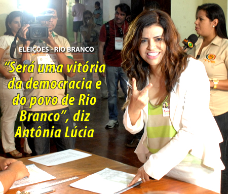 Cantando seu jingle de campanha e fazendo o gesto de vitória, a candidata à prefeitura de Rio Branco, Antônia Lúcia (PSC) chegou por volta de 8h 40min, na manhã deste domingo, 07, para votar na seção 380, do colégio Instituto São José, no centro da cidade.