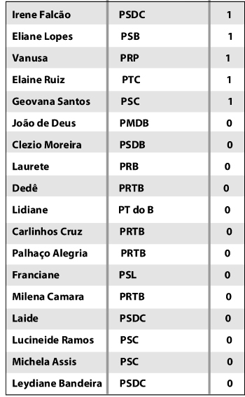 Mas o que dizer de postulantes de partidos como o PRB, aliado da poderosa Frente Popular, que é capitaneada pelo PT, que não contabilizaram votos? O fato curioso é que a maioria dos candidatos que zeraram em número de votos é do sexo feminino.