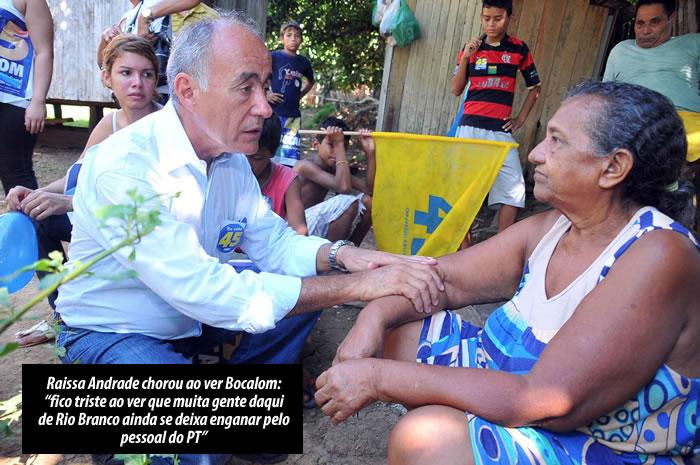 Ao chegar a um quarteirão andando sobre trapiches construídos pelos próprios moradores, o candidato encontrou a senhora Raissa Andrade que o conhece desde tempo que morou em Acrelândia. Ao ver Bocalom, a mulher começou a chorar lembrando-se de sua administração naquele município. “Desculpa eu estar chorando, mas sou testemunha de como o senhor é um bom administrador e fico triste ao ver que muita gente daqui de Rio Branco ainda se deixa enganar pelo pessoal do PT. Quero muito que o senhor ganhe esta eleição porque sei que o senhor vai ajudar as pessoas pobres como eu”, disse.