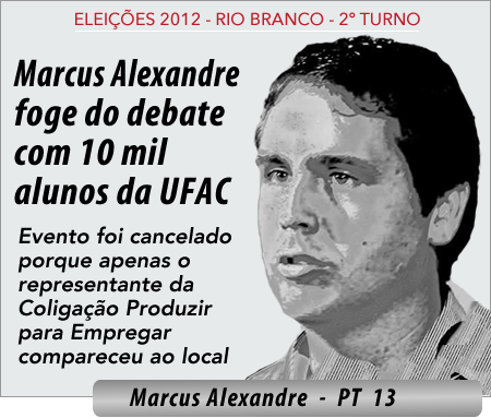 Marcus Alexandre havia sinalizado positivamente, através de sua assessoria, a sua presença no debate, mas voltou atrás, conforme esclarece uma nota pública emitida pelos cursos de Comunicação Social, Ciências Sociais, que realizariam o encontro no dia 19, próxima sexta-feira. O candidato da Coligação Produzir para Empregar, Tião Bocalom (PSDB) confirmou a presença até a data desta quarta-feira, quando, em razão da desistência do candidato do PT, os organizados, apoiados pelo Centro de Filosofia e Ciências Humanas da Ufac, se viram obrigados a lamentar o cancelamento do encontro.Os assessors do petista alegaram “incompetibilidade de agenda” para evitar o confronto de idéias com o candidato do PSDB, que teria como testemunhas, além dos acadêmicos, os técnicos administrativos e os professores universitários.