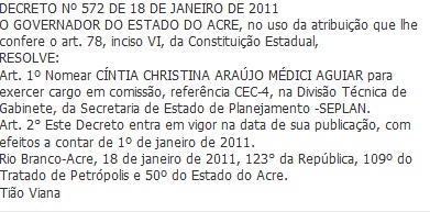 O Jornalista Fábio Pontes, em seu blog Política na Floresta, afirmou na manhã desta segunda-feira, 22, que o governador do Acre, Sebastião Viana, nomeou a ex-mulher do candidato Marcus Alexandre (PT) para cargo comissionado na Secretaria de Planejamento (Seplan). Cíntia Christina Araújo Médici Aguiar está como agente administrativo com salário de R$ 5,1 mil.
