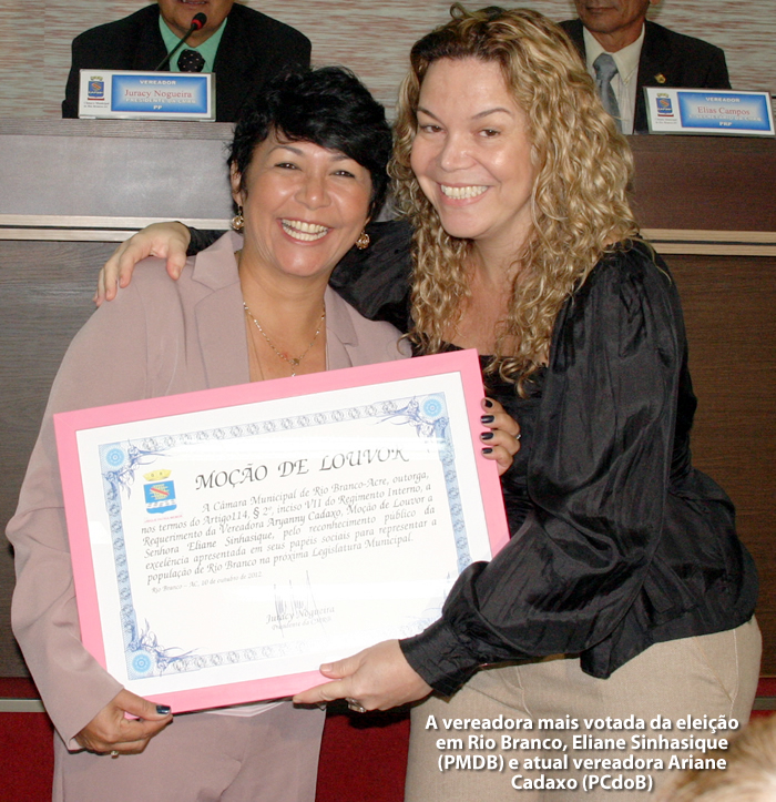 Ao lado das também eleitas Graça da Baixada (PSDC), Rose Costa (PT), e Roselane (PRP), Sinhasique foi homenageada com uma Moção de Louvor, proposta da vereadora Ariane Cadaxo (PC do B). Eliane foi a última das homenageadas a falar. Firme, mostrou que será um dos destaques positivos da nova legislatura.