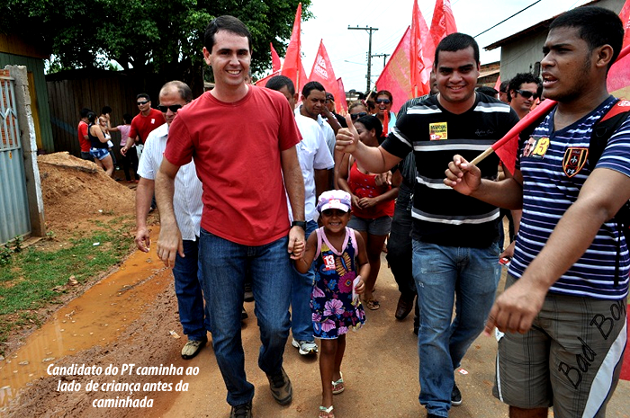 O candidato do PT, Marcus Alexandre, chegou há pouco ao bairro Bahia Velha, Baixada do Sol, onde faz a sua primeira caminhada do dia, junto com sua militância. A caminhada começou pela Rua Mend Sá, a principal do bairro.