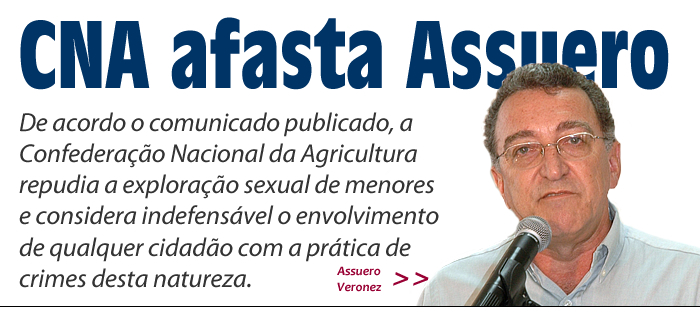 A diretoria da Confederação da Agricultura e Pecuária do Brasil (CNA) cumpre o dever de informar o afastamento imediato, deste colegiado, do presidente da Federação de Agricultura e Pecuária do Acre, Assuero Doca Veronez. Ele permanecerá afastado até que sejam concluídas as investigações policiais sobre suposta rede de prostituição de menores.