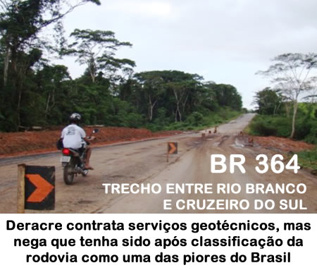 Depois de ter a malha viária estadual e federal classificadas como as piores estradas do Brasil, em pesquisa realizada pela Confederação Nacional do Transporte (CNT), o Departamento de Estradas de Rodagem, Infra-Estrutura Hidroviária e Aeroportuária do Acre – DERACRE anuncia a contratação da empresa Pattrol para execução de serviços geotécnicos nas rodovias estaduais e federais. O diretor de operações, Joselito Nóbrega, negou que o contrato seja resultado da classificação da malha viária pela CNT.