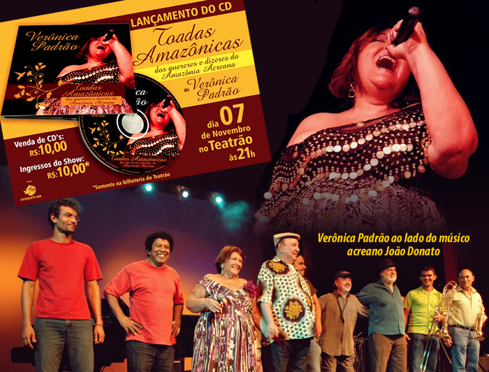 Verônica Padrão realizará um show para divulgar o seu novo disco nesta quarta-feira, 7, às 21 horas, no Teatro Plácido de Castro. Ela será acompanhada pelos músicos Geraldinho (violão), Nilton Bararu (sanfona), João Gabriel (percussão) e James Fernandes (contrabaixo e direção musical). “Toadas Amazônicas”, em produção desde 2005, carrega um significado que transcende o fazer artístico.