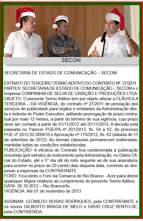 O prazo contratual estabelecido entre o governador Sebastião Viana e os marqueteiros Gilberto Braga e David Sento Sé tem validade até o dia 01 de novembro de 2013, segundo publicação no Diário Oficial do Estado, desta quarta-feira, 07.
