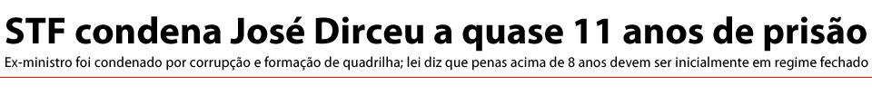 Dirceu foi condenado a 10 anos e 10 meses de prisão. Delúbio recebeu pena de 8 anos e 11 meses. Já Genoino pegou 6 anos e 11 meses. Segundo a legislação brasileira, o início do cumprimento da pena deve ser em regime fechado para condenados a mais de 8 anos. Leia todo conteúdo da Folha de S. Paulo