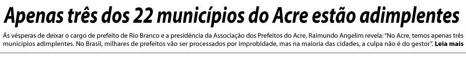 Segundo o petista, apenas três dos 22 municípios do Acre estão adimplentes. “No Acre, temos apenas três municípios adimplentes. No Brasil, milhares de prefeitos vão ser processados por improbidade, mas na maioria das cidades, a culpa não é do gestor”, diz Angelim.