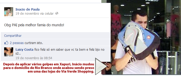 Segundo matéria publicada no blog Xapuri Agora, Inácio além de enganar velhinhos nos caixas eletrônicos da Agência do Banco do Brasil em Xapuri, é suspeito de se passar como vitima da alagação para ganhar donativos do governo. Inácio chegou em 2012 na cidade de Xapuri no início deste ano para estudar no Ifac, tendo solicitado acolhida na Paróquia de São Sebastião. Depois de aplicar vários golpes na cidade, mudou para o domicílio de Rio Branco onde acabou sendo preso em uma das lojas do Via Verde Shopping.
