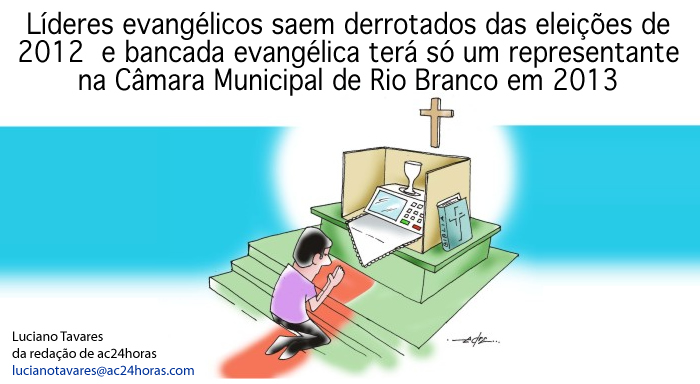 Os chamados projetos políticos dos líderes das principais igrejas do Acre falharam e a bancada evangélica da próxima legislatura, na Câmara de Vereadores de Rio Branco, terá apenas um representante, reconhecidamente, evangélico e eleito através de um projeto político religioso: o Pastor Manuel Marcos (PRB), da Igreja Universal do Reino de Deus, do Bispo Edir Macedo.