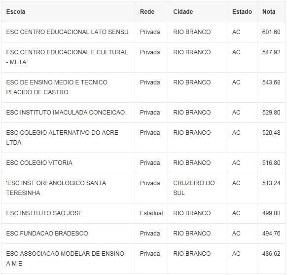 E entre as 13 escolas da Região Norte que obtiveram pontuação acima de 600 no Exame Nacional do Ensino Médio (Enem), e figuram entre as instituições de elite do Brasil, só uma é do Acre: o Centro Educacional Latu Sensu, da rede privada, com nota 601.60.