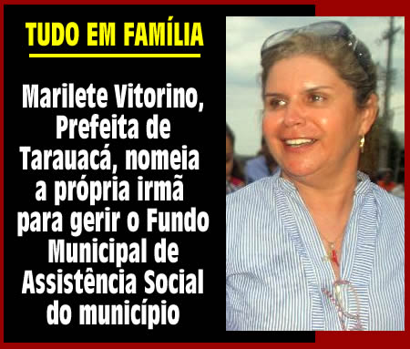 A Prefeita do Município de Tarauacá, Marilete Vitorino (PSD), tornou publico nesta terça-feira, 4, o decreto de nomeação no Diário Oficial da sua própria irmã, Mariluce Vitorino, para gerenciar o Fundo Municipal de Assistência Social da cidade. O decreto é do dia 18 de abril deste ano, mas somente hoje, quase 8 meses depois da nomeação, a portaria foi publicada.