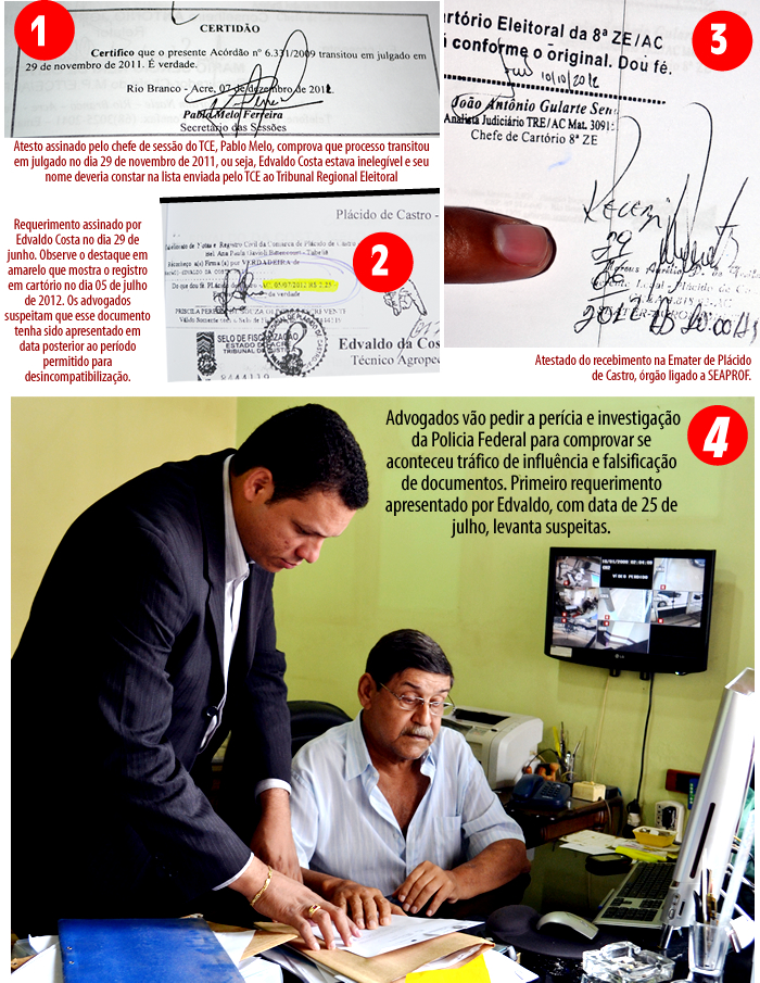 O primeiro requerimento apresentado pelo vereador Edvaldo Costa pedindo a sua desincompatibilização do cargo de Técnico Agropecuário, datado do dia 25 de julho de 2012 e protocolado na SEAPROF no dia 26 de julho do mesmo ano, leva os advogados da coligação suspeitarem de tráfico de influência e falsificação de documentos.