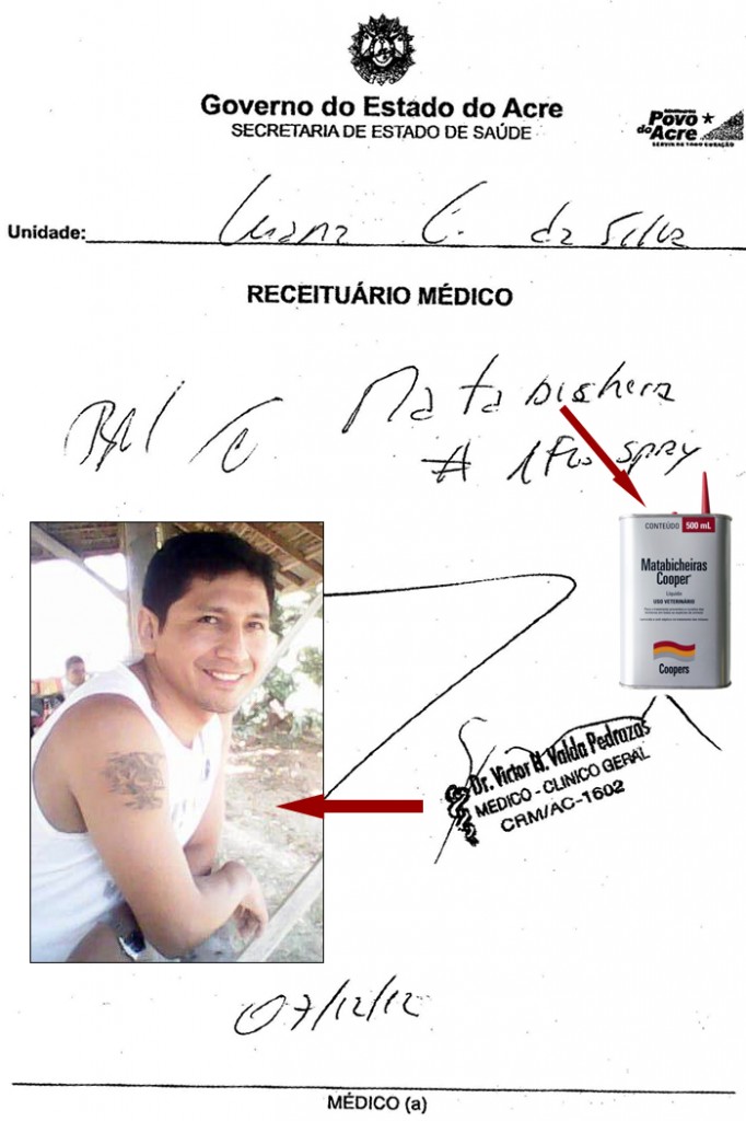 Uma família da zona rural de Sena Madureira denunciou nesta segunda-feira, 10, que o médico plantonista do hospital João Câncio, Victor Valda Pedrozas prescreveu um mata bicheira animal para curar as feridas na cabeça de uma criança de apenas seis anos.