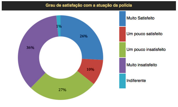 Contando juntos os “insatisfeitos” e os “pouco satisfeitos”, a cifra chega a 63%. Considerando a camada mais pobre da população, o índice pula para 65%. Na camada mais rica, cai para 62%.“É um dado alarmante, principalmente se considerarmos os últimos acontecimentos envolvendo o assassinato de policiais e diversas pessoas na periferia”, analisa Luciana Gross Cunha.