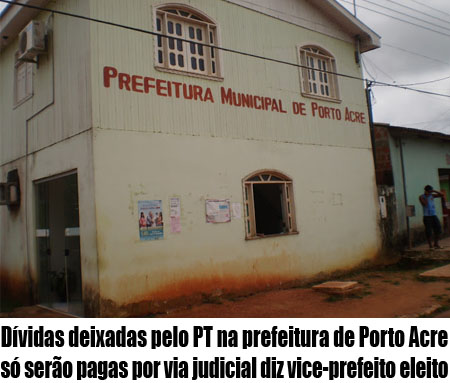 A prefeitura de Porto Acre, administrada pelo Partido dos Trabalhadores (PT), estaria afundada em dívidas não só com o funcionalismo público, mas também com a maioria dos fornecedores, empreiteiras e prestadores de serviços, é o que informa o vice-prefeito eleito Sérgio Baquer (PSDB).