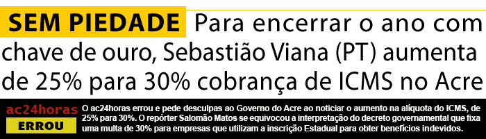 ac24horas errou e pede desculpas ao Governo do Acre e aos leitores ao noticiar o aumento na alíquota do ICMS, de 25% para 30%. O repórter Salomão Matos se equivocou na interpretação do decreto governamental que fixa uma multa de 30% para empresas que utilizam a inscrição Estadual para obter benefícios indevidos.