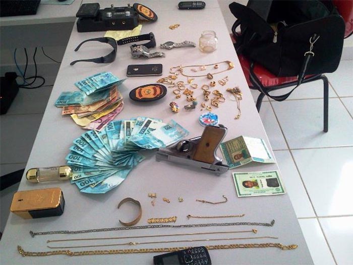 Em poder dos larápios a polícia apreendeu uma pistola calibre 32 italiana, várias peças de joias, computador portátil, guitarra, pedal, violão, caixas acústica e monitor de TV, além de mais de R$ 3,7 mil em dinheiro.