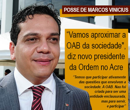 Em seu discurso de posse, Marcos Vinicius agradeceu o apoio que recebeu dos colegas durante a eleição, e fez uma referencia especial a Florindo Poersch, a quem substitui na OAB/AC. Ainda na sua fala, o novo presidente disse que um de seus desafios e objetivos é aproximar a OAB da sociedade.