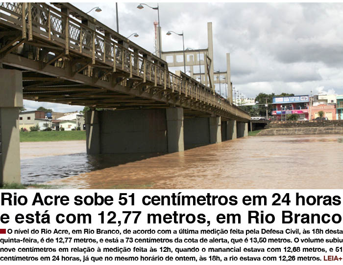 O nível do Rio Acre, em Rio Branco, de acordo com a última medição feita pela Defesa Civil, na manhã desta sexta-feira, 25, é de 12,99 metros, e está a 51 centímetros da cota de alerta, que é 13,50 metros.
