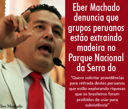 O deputado Eber Machado (PSDC) denunciou na tribuna da Aleac na manhã desta quarta-feira (20), a presença de grupos peruanos acampados em território brasileiro fazendo a extração de madeira na serra do Divisor. Machado afirmou que os fiscais do ICMBio confirmaram a irregularidade, mas nenhuma providência foi tomada pelas autoridades federais.