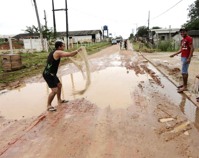 Cansados de aguardar por melhorias, alguns moradores se reuniram no final da tarde e com bom humor, usaram vara e rede de pesca em sinal de protesto.