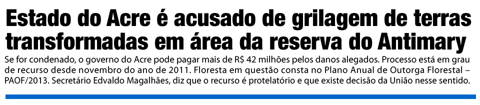 A empresa AGE construções e comércio Ltda processou o Estado do Acre por alegar ser proprietária de um imóvel rural registrado na serventia imobiliária do cartório da cidade do Bujari que o governo, segundo a denúncia, ilegalmente vem tentando “grilar”. O processo foi distribuído na Justiça em julho de 2010 e encontra-se em grau de recurso. Os danos alegados ultrapassam os R$ 42 milhões. Por telefone, o secretário de estado e desenvolvimento florestal, da Indústria do Comércio e dos Serviços Sustentáveis, Edvaldo Magalhães, diz que o recurso é protelatório e que existe decisão da União nesse sentido.