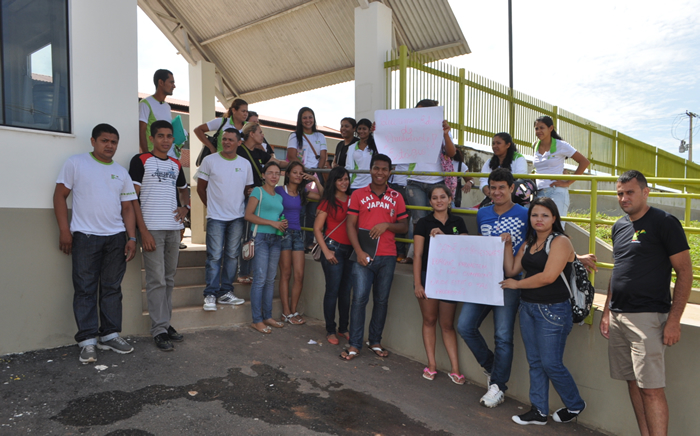 Na entrada da instituição, os estudantes estenderam cartazes com os dizeres “queremos educação de qualidade! Estágio” e “cadê os professores, porque prometem e não cumprem? Onde está o tal progresso?”.