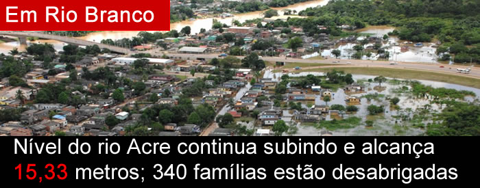 O nível do rio Acre, em Rio Branco, não para de subir. De acordo com a Defesa Civil Estadual, as águas alcançaram a marca de 15,33m na manhã desta quinta-feira, 28, ultrapassando em 1,33m a cota de transbordamento, que é de 14 metros.