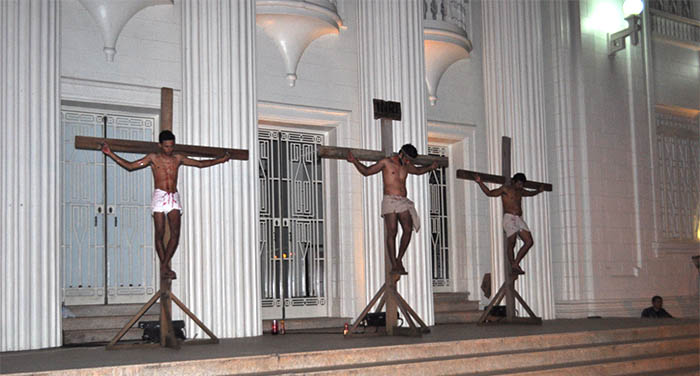 A frente do Palácio Rio Branco virou cenário para encenação, no começo da noite desta Sexta-Feira Santa, de um dos mais importantes acontecimentos bíblicos do Novo Testamento: a crucificação e morte de Jesus Cristo.