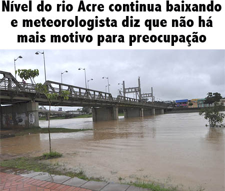 Pela previsão do meteorologista Davi Friale, “o nível do rio Acre, em Rio Branco, ainda vai subir, mas não há mais motivos para ficar muito preocupado já que, sem chuvas, as águas estarão diminuindo, nos próximos dias”.