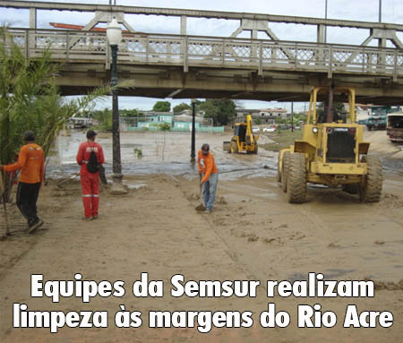 Equipes da Secretaria Municipal de Serviços Urbanos (Semsur) realizam nesta manhã a limpeza nas margens do Rio Acre entre as Pontes JK e Sebastião Dantas. A frente de serviço faz parte da Operação de Volta pra Casa, lançada na manhã desta segunda-feira (1º), pelo prefeito da cidade de Rio Branco, Marcus Vianno pátio da secretaria.