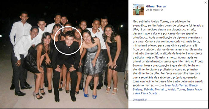 Meu sobrinho Aluizio Torres, um adolescente evangélico, sentiu fortes dores de cabeça e foi levado a UPA, lá os médicos deram um diagnóstico errado, disseram que a dor era por causa do seu aparelho ortodôntico. Após a medicação de dipirona o enviaram pra casa. Como a dor continuou cada vez mais forte, minha irmã o levou para uma clínica particular e lá ficou constatado tratar-se de um aneurisma. Se minha irmã não tivesse tido a atitude de levá-lo à uma clínica particular hoje o Alú estaria morto. Agora, após os primeiros atendimentos temos que interná-lo no Pronto Socorro. Nossa preocupação é que ele não tenha um atendimento digno e profissional como no primeiro atendimento da UPA. Por favor compartilhe isso para que a secretária de saúde ou o próprio governador tome conhecimento desse fato e não deixe meu amado sobrinho morrer.