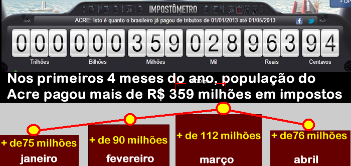 Mesmo com uma queda acentuada na arrecadação dos cofres públicos no mês de abril, nos primeiros 4 meses deste ano, a população do Acre já pagou mais de 359 milhões em impostos. Em comparação ao mesmo período de 2012 (cerca de R$ 308 milhões), a arrecadação superou mais de R$ 50 milhões em impostos federais, estaduais e municipais. A informação consta no balanço divulgado em tempo real pela Associação Comercial de São Paulo (ACSP), responsável por validar o Impostômetro.