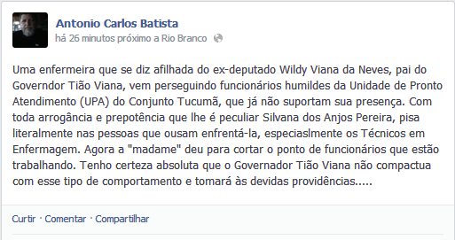 De acordo com o jornalista, a enfermeira Silvana dos Anjos pereira é arrogante e prepotente e gosta de pisar (humilhar) os servidores, chegando ao extremo de cortar o ponto de servidores que estão trabalhando. Finalizando sua postagem Antônio Carlos diz ter certeza que o governado Sebastião Viana não compactua com os atos da enfermeira e pede providencias para o caso.