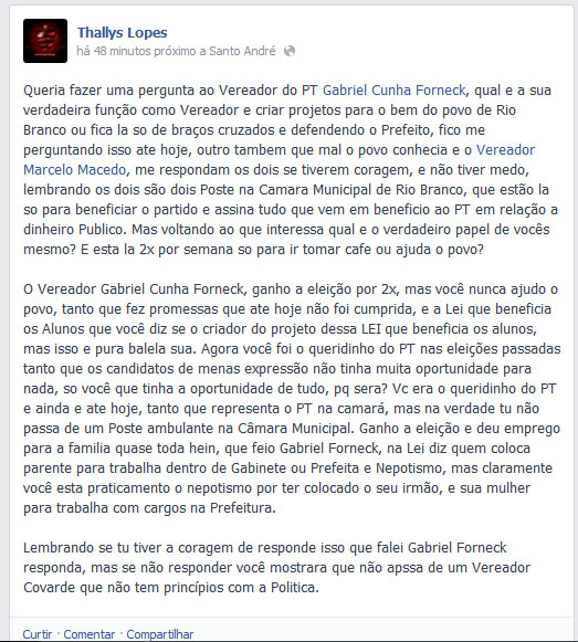 Um ex-militante usou sua página no facebook, para acusar o vereador petista Gabriel Forneck pela prática de nepotismo na distribuição de cargos na prefeitura de Rio Branco. Para Thallys Lopes, Forneck estaria na Câmara de Vereadores de Rio Branco, apenas para fazer a defesa do prefeito Marcus Viana e por interesses financeiros.