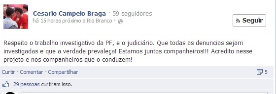 Desde a noite desta sexta-feira, 11, centenas de militantes do Partido dos Trabalhadores do Acre, lotados em Cargos no Governo e na Prefeitura, fazem campanha nas redes sociais pela em nome da honra dos empreiteiros e secretário de Estado presos na “Operação G7”, desencadeada pela Policia Federal em solo acreano. Membros da Juventudes do PT a todos instantes postam mensagem enaltecendo “os companheiros”, afirmando que eles “não estão sozinhos”.