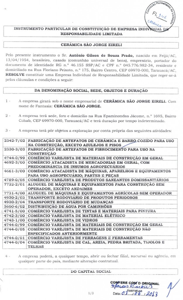 A Cerâmica São Jorge, a toda evidência, não é de propriedade do Sr. Raimundo Damasceno, mas sim, do Sr. Antônio Gilson Prado, consoante documentação fiscal e empresarial acostada no bojo da licitação e que segue abaixo reproduzida, não sendo aquele sequer sócio minoritário, por se tratar, até mesmo, de empresa individual, importando destacar que mesmo que fosse sócio ou até proprietário, nada impediria que participasse do certame, haja vista que, a licitação é um ato público, onde todos que preencherem os requisitos podem dela participar ou, até mesmo, qualquer cidadão tem o direito de sobre ela obter quaisquer informações, não havendo óbice algum de ordem legal à participação do Sr. Raimundo Damasceno ou de qualquer de suas empresas em licitações do Município.