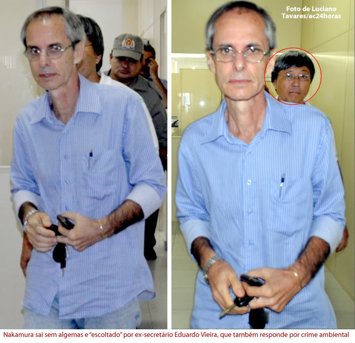 Depois de cinco horas em audiência de instrução por prática de crime ambiental, o empresário Sérgio Nakamura, dono da empresa Ábaco, deixou a 2ª Vara do Fórum Criminal de Rio Branco, sem algemas. Às 8h20 da manhã desta terça-feira, o empresário chegou algemado e escoltado por policias no veículo conhecido como camburão, que faz o transporte de presos do sistema penitenciário do Acre. Na audiência, a pedido do advogado de defesa de Nakamura, Gumercindo Rodrigues, o Juiz Gilberto Matos dispensou o uso das algemas.