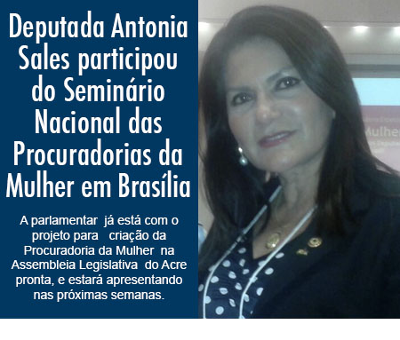 A deputada Antonia Sales (PMDB),participou nesta quinta –feira, 13, em Brasília do Seminário Nacional das Procuradorias da Mulher da Câmara e do Senado com o tema “ Fortalecimento e capacitação da Rede de Procuradorias da Mulher nos Estados e Municípios e a Participação Feminina nos Parlamentos”.