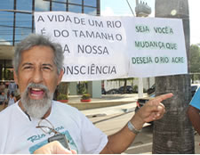 O geógrafo Claudemir Mesquita, conhecido por sua luta em defesa do Rio Acre, integra as dezenas de manifestantes que estão no centro da capital para o Dia do Basta. Preocupado com o nível do rio, ele pediu que as pessoas ‘olhem’ para o manancial. “Se não tivermos um olhar acolhedor, a enchente, o rio vai vir tão violento quanto essas manifestações que hoje ocorrem aqui”, alertou.