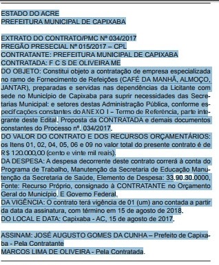 A Prefeitura da pequena cidade de Capixaba vai gastar R$ 266,7 mil em serviços de alimentação em dois contratos assinados e publicados no Diário Oficial do Estado do Acre (DOE) desta segunda-feira (28). A validade dos contratos é de 12 meses a partir da assinatura.