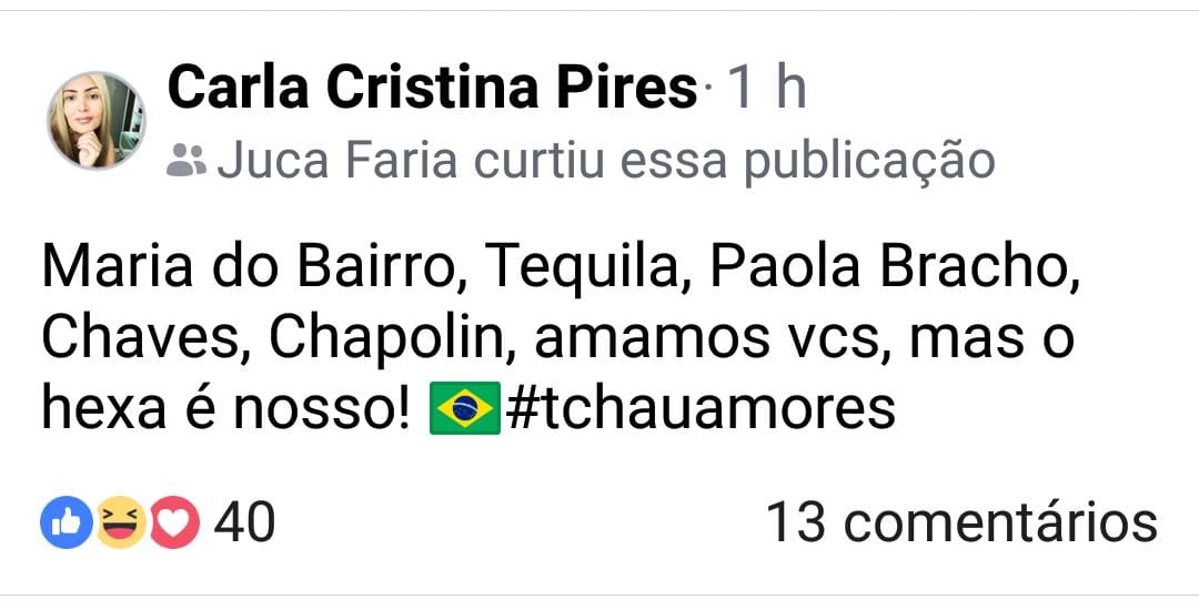 Tequila, Paola Bracho, Chaves, Chapolin, amamos vcs, mas o hexa é nosso!#tchauamores”, brincou a internauta Carla Cristina Pires.