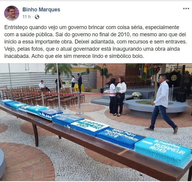 O ex-governador Binho Marques (PT) usou as redes sociais para demonstrar que não gostou da brincadeira que o Sindicato das Indústrias de Panificação e Confeitaria do Estado do Acre (Sindpan/AC), disponibilizou na entrada da ala vertical da inauguração do novo Pronto-Socorro de Rio Branco. Iniciada em seu governo, no final de 2010, a obra perdurou durante os dois governos de Sebastião Viana e foi apenas finalizada agora em agosto de 2019.
