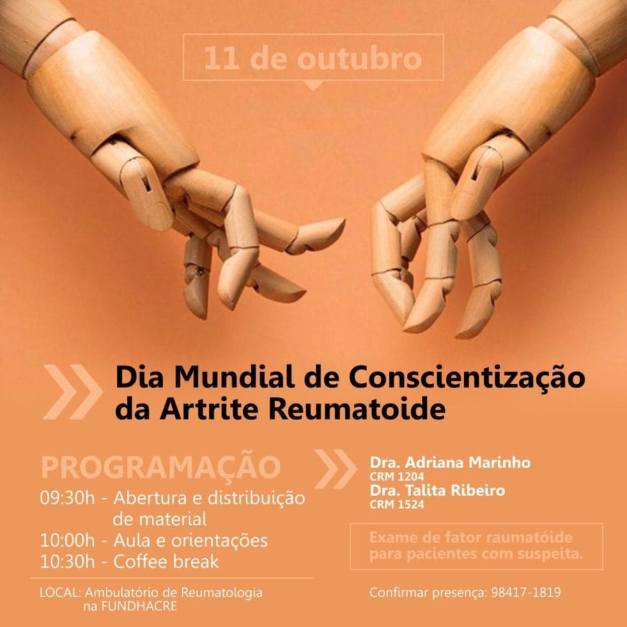 Para alertar e conscientizar a população acreana sera realizado nesta sexta-feira (11) um evento em alusão ao Dia Mundial da Conscientização da Artrite Reumatoide, que será realizado no ambulatório de Reumatologia da Fundhacre as 9h30.