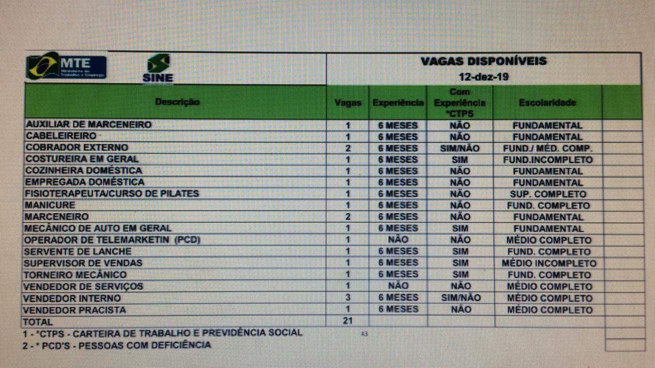 Nesta quinta-feira (12) o Sistema Nacional de Emprego do Acre (Sine) está disponibilizando 21 vagas de emprego em diversas áreas para a capital Rio Branco. Os candidatos devem ir até o Sine, localizado na OCA, para manifestar interesse.
